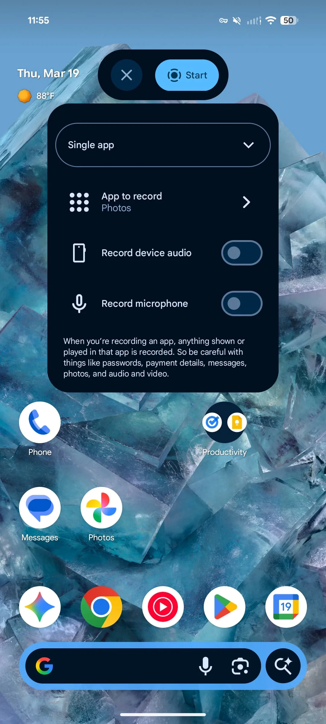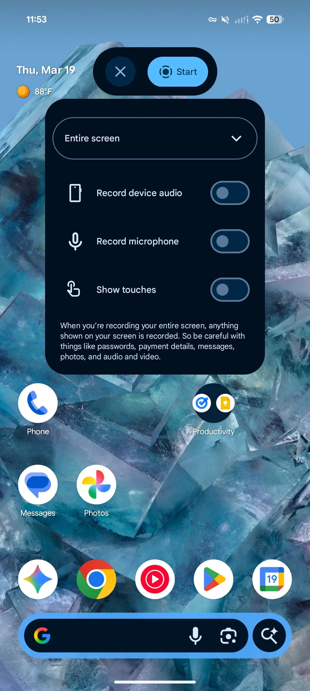 After tapping the Quick Setting Tile, you get a new floating pill to “Start” or make changes, like Entire screen or Single app. Options include:
