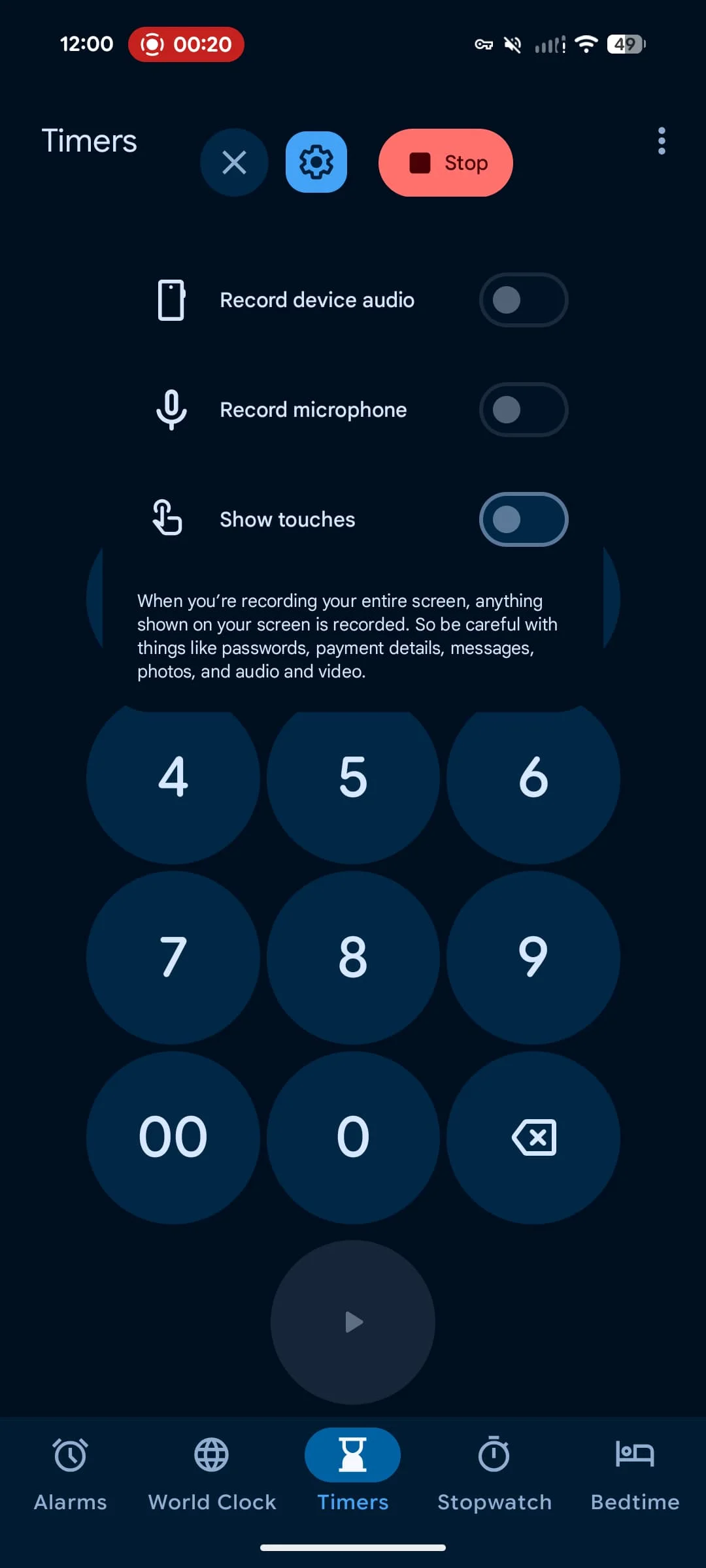 - Entire screen: Record device audio, Record microphone, Show touches