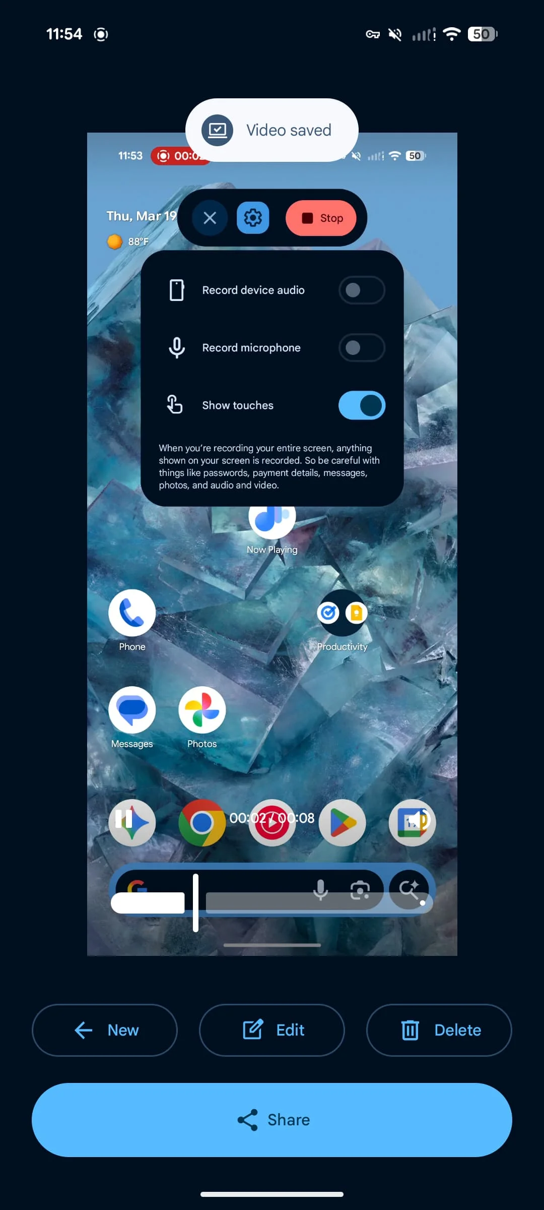 After the recording is initiated, you can tap the status bar indicator to bring the floating UI and make changes by tapping the settings gear or “Stop.” Upon ending, you’re taken to a new interface that lets you preview the clip, “Edit,” “Delete,” or “Share.” Tapping “New” brings you back to the tool.