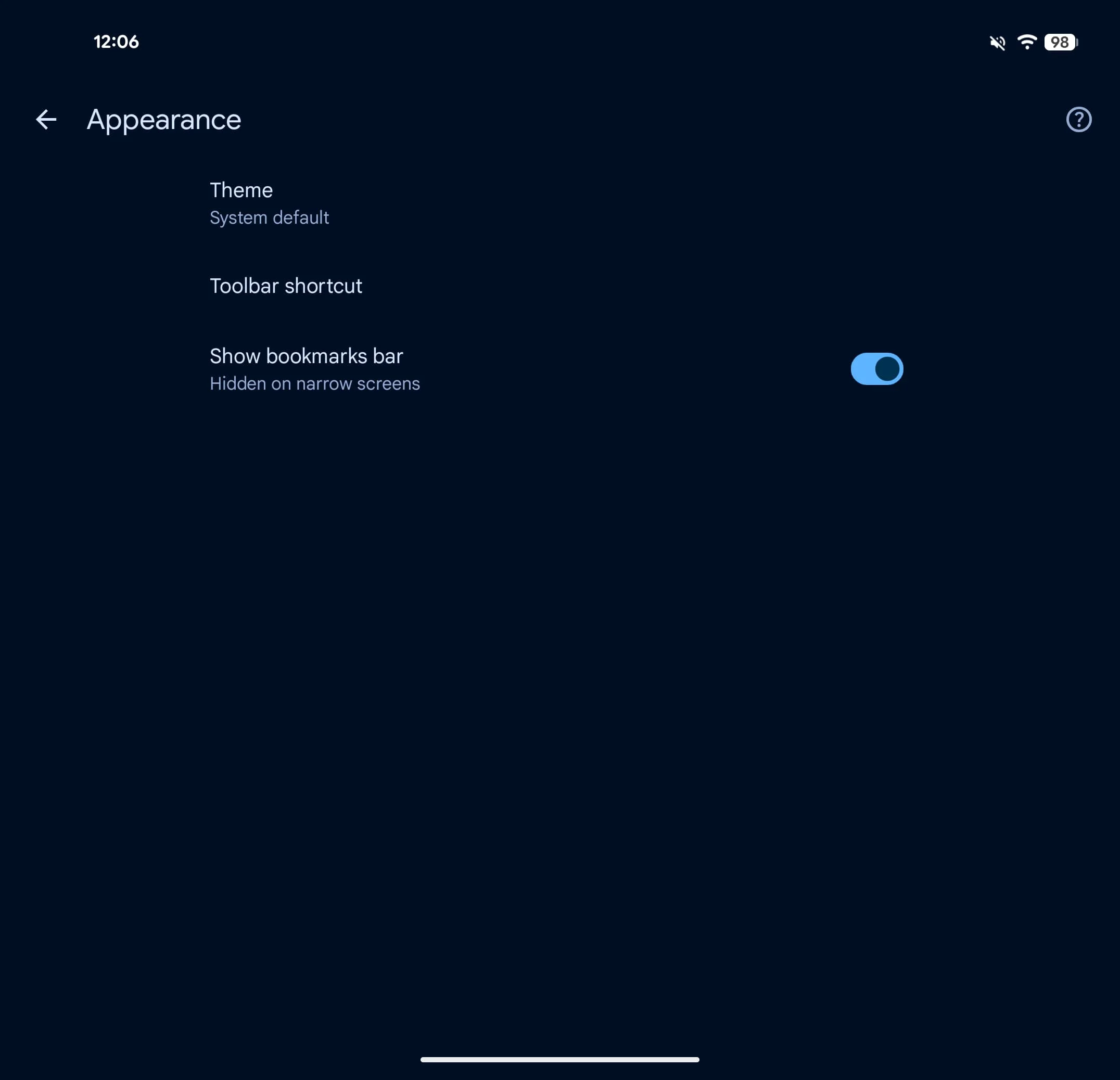 To enable, go to Settings > Appearance > Show bookmarks bar. The interface is “Hidden on narrow screens,” like phones. This is appearing with version 146 of Chrome for Android. If the Appearance menu is not yet available on your device, Force stop Chrome from the App info menu.