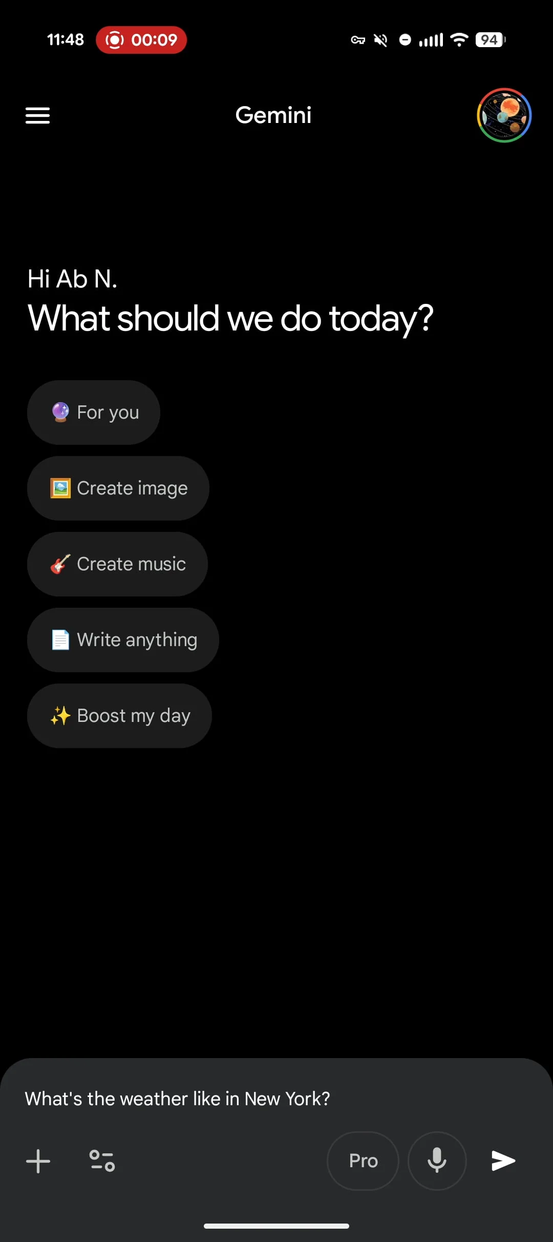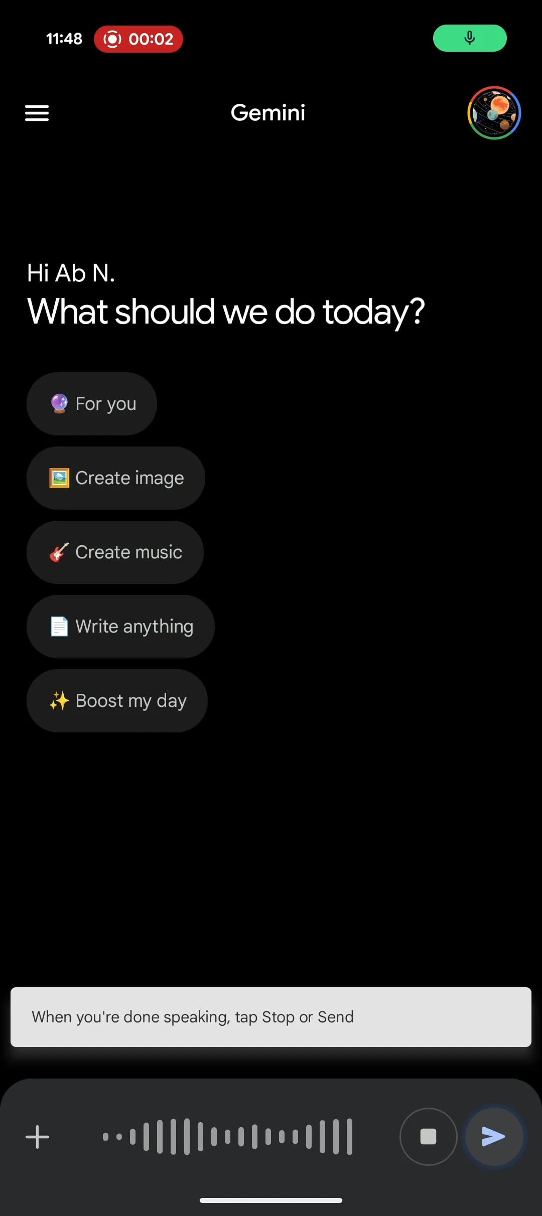 The “Send” circle — which slightly pulsates — immediately enters the command. Users get to see what they said above as the prompt runs. If you don’t do anything, voice input stays active for a while.